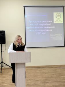 На колегії також підбили підсумки проведення атестації та організації курсів підвищення кваліфікації педагогічних працівників у 2025 році. Як зазначила головна спеціалістка відділу науки і педагогічних кадрів Світлана Новосядла, незважаючи на правовий режим воєнного стану, постійне підвищення кваліфікації є законодавчим обов’язком та невіддільною умовою професійного розвитку педагогів. Протягом 2025 року атестувалося 1187 педагогічних працівників. Присвоєно педагогічні звання: «старший учитель» — 2, «учитель-методист» — 2. Кваліфікаційні категорії підтвердили: «спеціаліст» — 37, «спеціаліст другої категорії» — 96, «спеціаліст першої категорії» — 167, «спеціаліст вищої категорії» — 144. 1086 керівників та педагогічних працівників пройшли курси підвищення кваліфікації. Найбільше педагогів підвищували кваліфікацію в Хмельницькій гуманітарно-педагогічній академії імені Анатолія Назаренка.