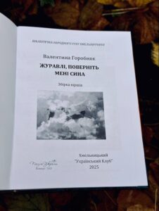 За меценатської підтримки Народного Руху України Хмельниччини та сприяння творчо-видавничої студії “Поетичний клуб” (м. Хмельницький) у видавництві “Поезія України” нещодавно вийшла у світ книга віршів хмельничанки Валентини Горобняк “Журавлі, поверніть мені сина!”, яка стала сповіддю матері, крізь серце й життя якої пройшла війна — з її безмежно болючими втратами, з молитвою за синів-героїв, за понівечену, але нескорену долю рідної України. Це розповідь про духовну силу, щоб жити, дочекатись Перемоги, задля якої добровільно, у 2014 році, стали на боротьбу з ворогом її сини-герої, і заради якої один із синів заплатив найдорожчим — життям.