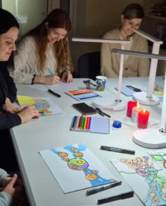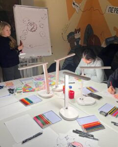 Дружини ветеранів та військових разом з психологинею Іриною Йолтухівською працювали з відновленням внутрішнього балансу енергій інь-янь через малювання нейрографічними лініями. Нейрографіка — це арттерапевтичний метод, який м’яко й безпечно допомагає знизити рівень стресу, заспокоїти нервову систему, гармонізувати емоційний стан, віднайти внутрішній ресурс через контакт із власною творчою частиною, активувати креативність та нейропластичність мозку.