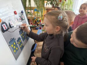Так, у Хмельницькому ЗДО «Кульбабка» діти середньої групи разом з Добриком і Веселинкою «волонтерили» на ігровому майданчику, збирали сміття і несли його до відповідного сміттєвого бака. Виконуючи це завдання, діти закріпили знання з математики. Далі розкладали печиво для наших захисників: велике, менше, найменше за розміром у відповідні коробки. У ході заняття малята були вправними волонтерами, попрацювали на славу! На завершення ще й взялися проявити свої конструкторські здібності, збираючи різні фігури.