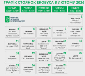 Жителі громади можуть безкоштовно позбутися небезпечних побутових відходів, скориставшись послугами Екобуса за наступним графіком: